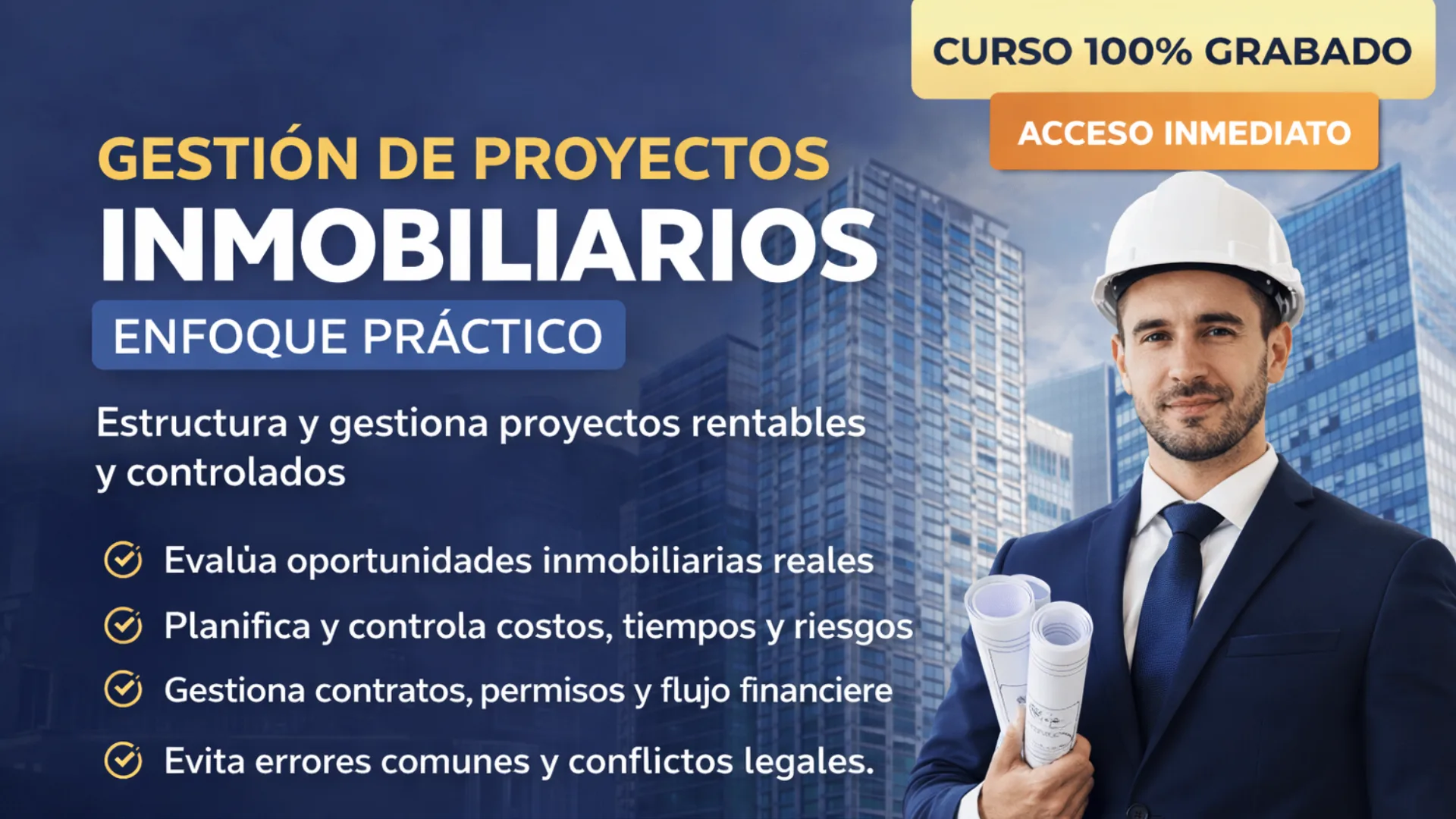 El curso tiene un enfoque 100% práctico, basado en casos reales del mercado inmobiliario, con un lenguaje claro y aplicable a proyectos pequeños, medianos y grandes, evitando errores comunes, pérdidas económicas y conflictos legales.